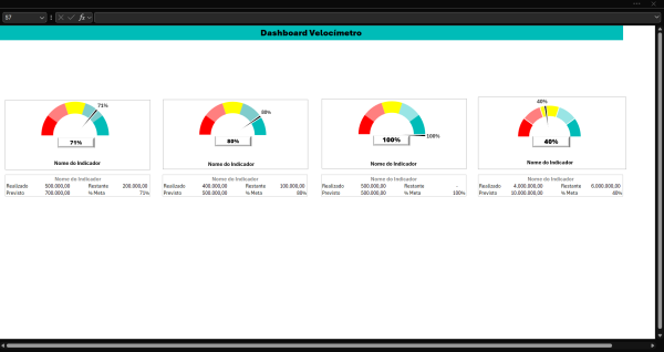 Apresentamos nossos Painéis de Velocímetros em Excel, disponíveis em versões com 4, 8 e 12 velocímetros, perfeitos para atender todas as suas necessidades analíticas!