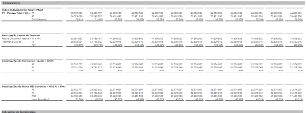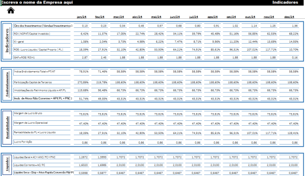 - Mais de 30 Indicadores Financeiros: Tenha acesso a uma ampla gama de indicadores financeiros, incluindo liquidez, rentabilidade, endividamento, eficiência e muito mais.